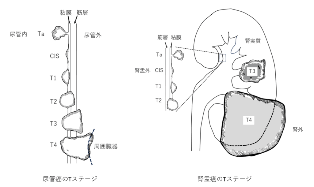 以上のように腎盂癌、尿管癌の診断は難しい上に、よく同じ尿路で頻度の高い膀胱癌と比較されることが多いですが、膀胱癌と比べて癌が進行していることが多いです。それは、腎盂癌、尿管癌は尿路の内側の粘膜から発生しますが、膀胱癌と比べて壁が薄く容易に壁の外まで広がる(浸潤)からです。