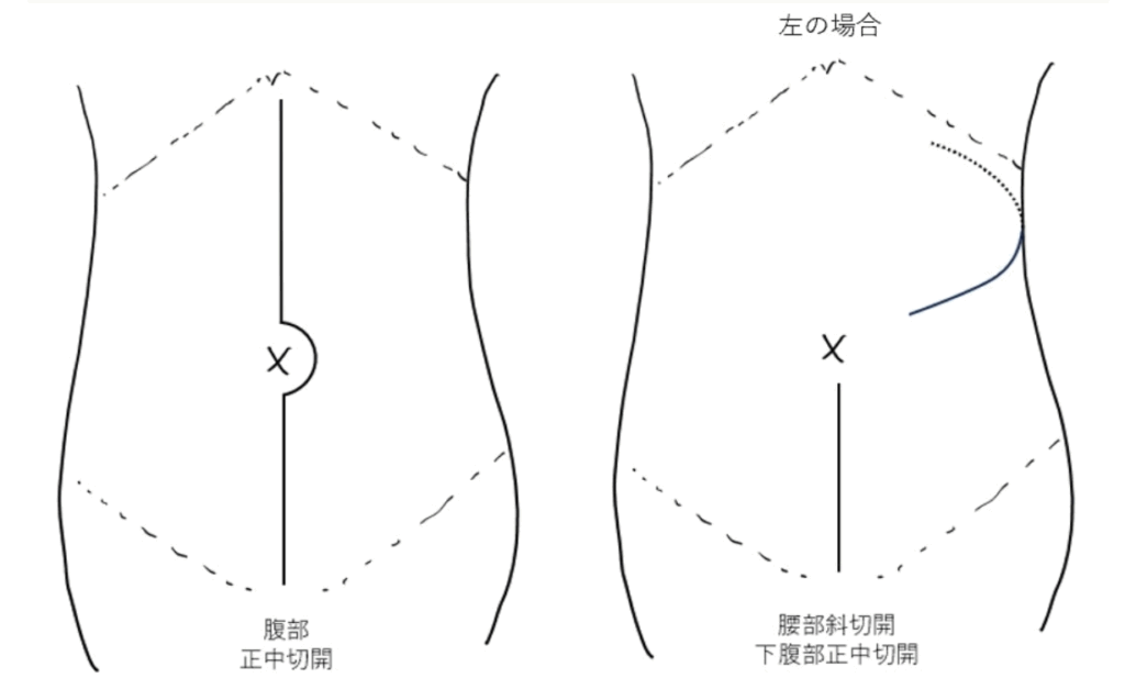 2)腹部正中に1か所の長い切開、もしくは側腹部および下腹部に10cm前後の 2 か所の皮膚切開を行います。側腹部の場合には肋骨を一部切離することがあります。
