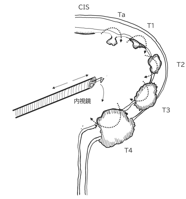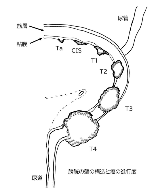 膀胱癌の場合には、癌が膀胱の壁のどの程度の深さまで進んでいるかが重要となります。