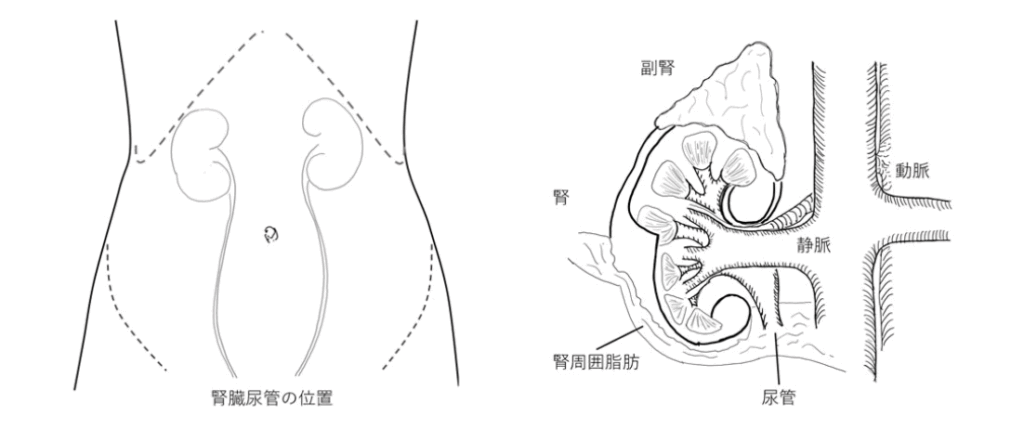 腎は左右によって隣り合う臓器が異なります。右腎であれば肝臓、十二指腸、上行結腸、下大静脈、右副腎、左腎であれば脾臓、膵臓、下行結腸、左副腎、大動脈です。癌の進行度(周囲への拡がりの具合)や手術の操
