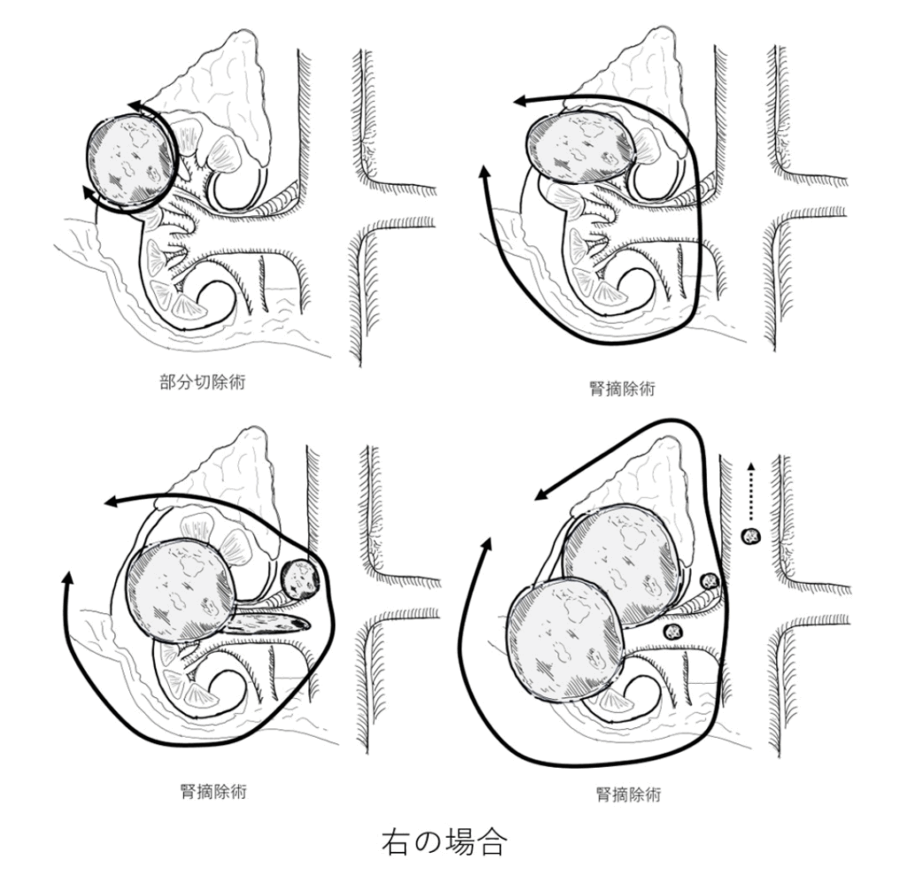 の周囲にあるリンパ節や副腎を合併切除することがあります。