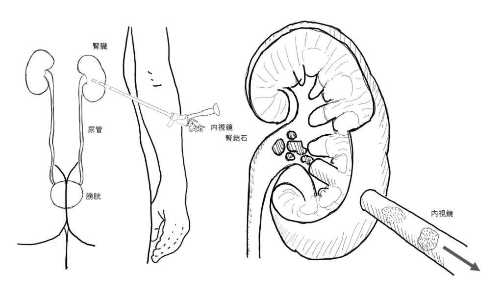 もともとある尿路に内視鏡を通して砕石します。経皮的手術と比べて負担が少ないメリットはありますが、砕ける結石の大きさに限度があり、およそ15mm程度までです。