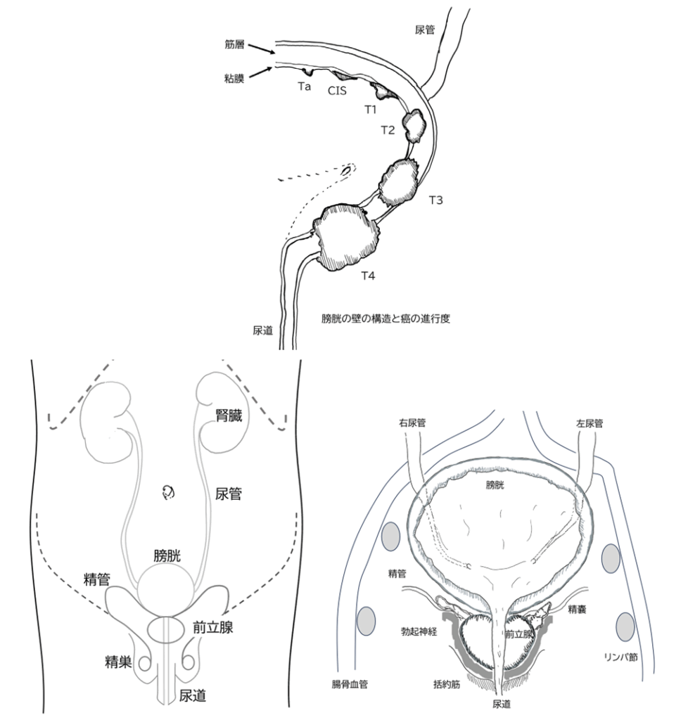 膀胱癌は膀胱壁の内側の粘膜から発生します。進行すると癌の根の部分が膀胱の壁の深い部分(筋層)まで広がっていきます。膀胱癌の癌細胞の悪性度や癌の進行の程度により治療法が決まります。