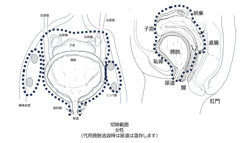 女性の場合には、子宮・卵巣・膣の一部も合併切除することが標準的です。