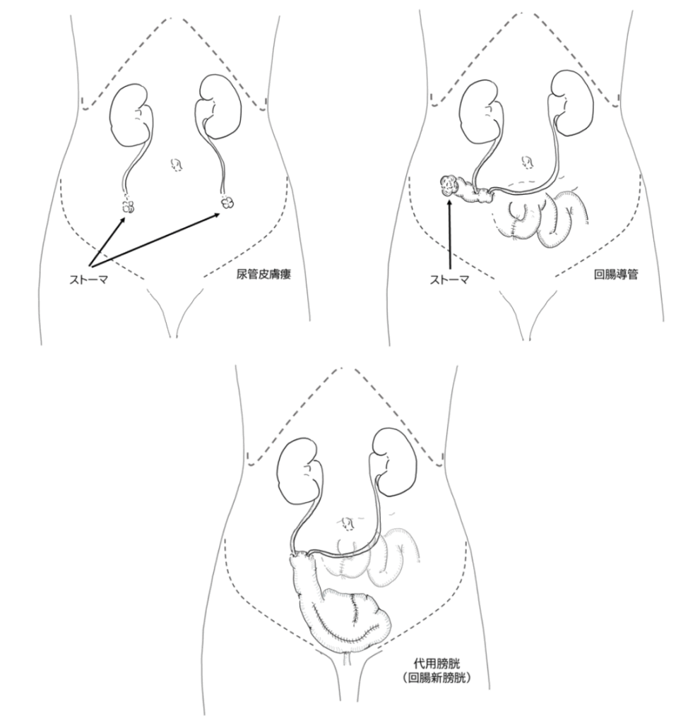 回腸導管と呼ばれる、小腸を利用して腹部に尿が流れ出る出口を作る方法と、代用膀胱と呼ばれる、これも小腸を利用して膀胱のような袋状の臓器を作りもともとの尿道へ尿を流す方法が代表的な尿路変向術です。