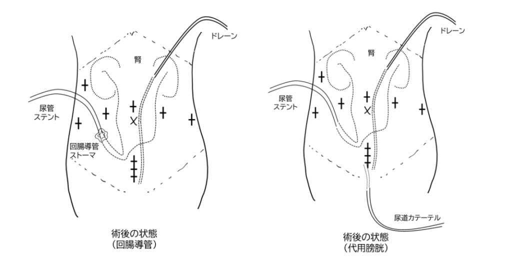 回腸導管の場合にはストーマの袋の張り替えの練習をします。代用膀胱の場合には時間を決めて排尿の練習をします。入院期間は2-3週間です。